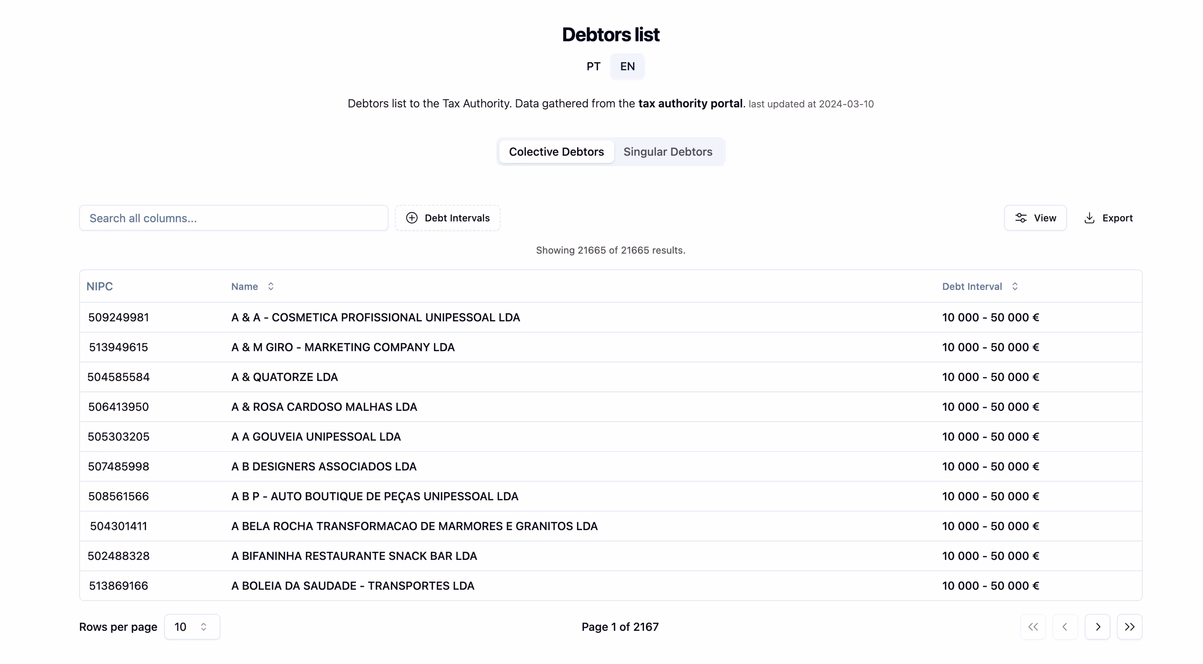 With the scraper and its accompanying frontend, I aimed to simplify access to the Portuguese Tax Authority’s debtors’ data. By automating the extraction process and presenting the information in a more user-friendly manner, individuals and businesses can now navigate the dataset effortlessly.